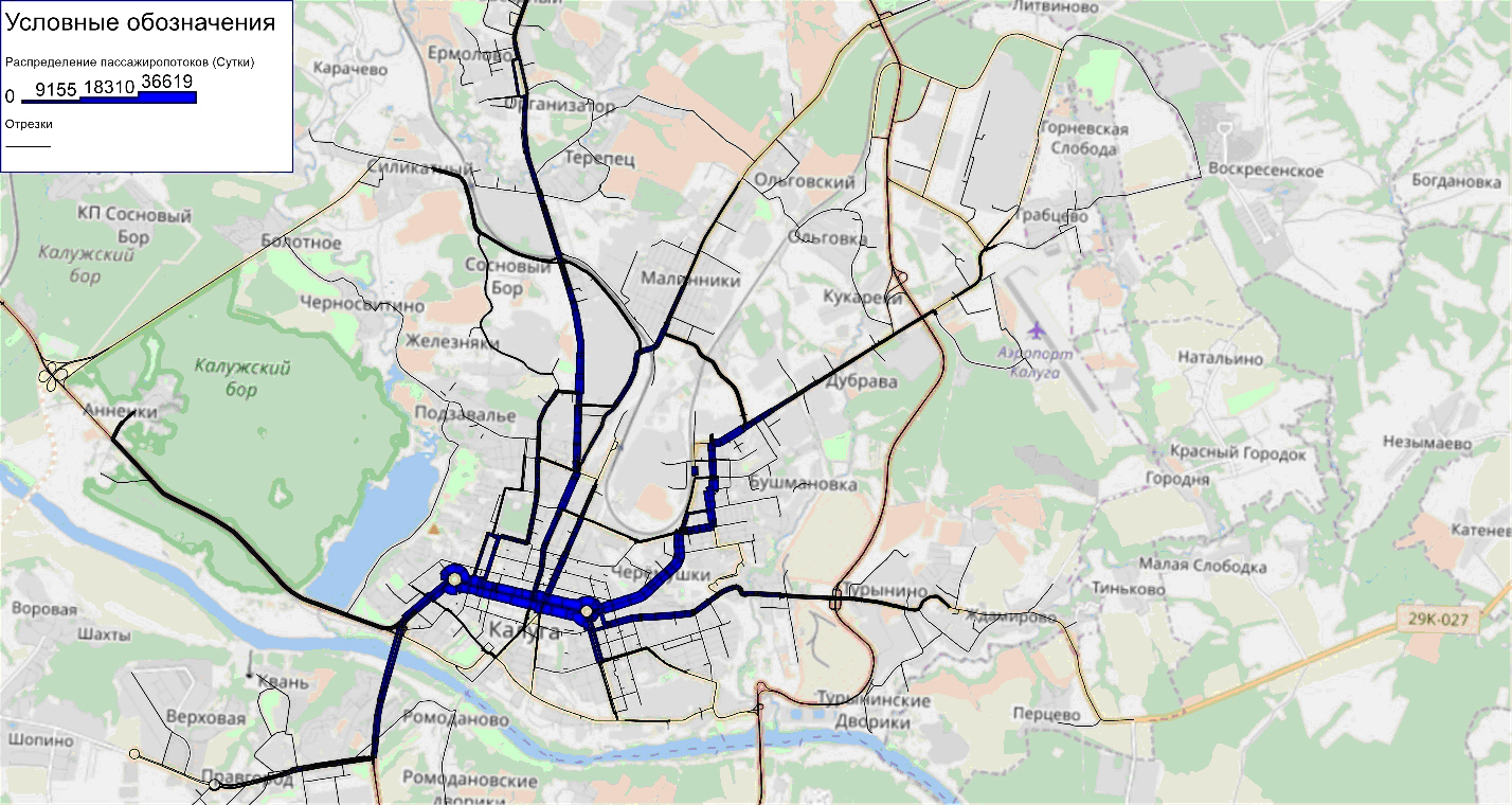 На рисунке 17 представлена картограмма пассажиропотоков маршрутной сети общественного транспорта города Калуги.