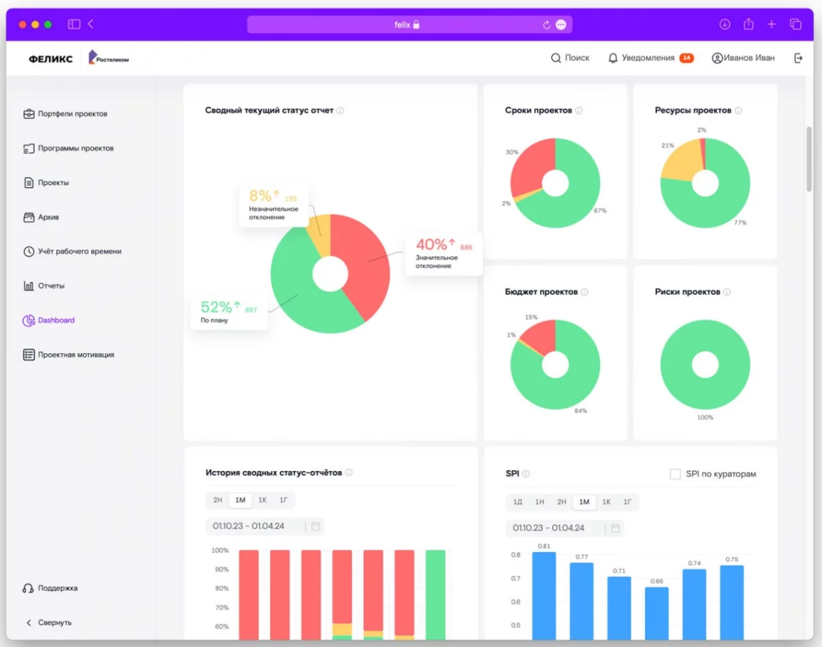 «Решения для цифровизации систем управления становятся наиболее актуальными, учитывая возрастающую потребность бизнеса и корпораций в российских ИТ-системах и стремление к эффективному использованию ресурсов. «Феликс» уже используется в «Ростелекоме» с 2020 года. Начиная с 2023 года ИС используется как основная корпоративная система портфельного управления в ведении корпоративного проектного офиса «Ростелекома». В настоящее время в системе ведется уже боле 1 400 крупных программ и проектов в разных подразделениях компании, в том числе коммерческих», — сказал руководитель проектного управления «Ростелекома» Александр Нудельман.