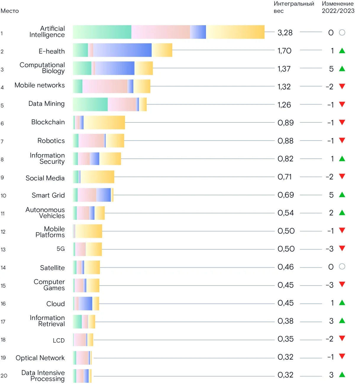 шестой год подряд. А в топ-3 треков произошли важные изменения: по интегральной оценке, на второе место вышел диджитал в интересах здоровья (E-health), а на третьем месте оказалась вычислительная биология (Computational biology), поднявшись сразу на пять строчек. Причем общее лидерство ИИ обеспечивают патенты и публикации, а вот инвесторы больше всего вкладываются в E-health и Computational biology.