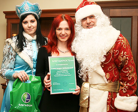 По прибытию на мероприятие гости были приятно и неожиданно удивлены - вместо сотрудников компании их встречали настоящий Дед Мороз и Снегурочка. Как выяснилось позже, в роли Дед Мороза выступал директор компании Вячеслав Москвитин, а Снегурочку представляла PR-щик Данилова Юлия. На дружественной встречи всем участникам были презентованы специальные подарки от МегаФона.