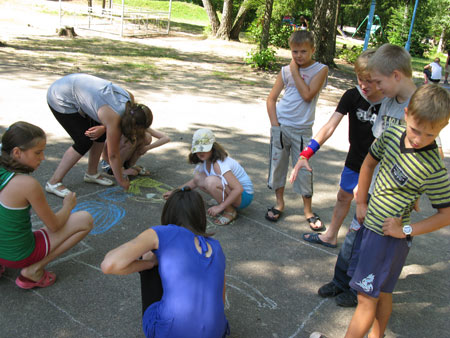Затем по 4-5 представителей от каждого из 9 отрядов приняли участие в викторине, цель которой – закрепление знаний правил электробезопасности. Все команды безошибочно ответили на все вопросы. Следующий этап – конкурс рисунков на асфальте «Электричество: друг или враг?». Каждая команда получает упаковку мелков, придумывает свой сюжет и рисует. Дети отразили в своих работах ситуации, в которые может попасть человек, пренебрегающий правилами поведения вблизи энергообъектов: горе-рыбак удит рыбу под линией электропередачи, незадачливый турист не спешит во время грозы покидать трассу ВЛ, дети палками пытаются откинуть оборванный провод. Защищая свои нарисованные проекты, дети давали однозначную оценку действий героев своих рисунков: так поступать ни в коем случае нельзя. Надо отметить, что практически во всех работах были знаки электробезопасности, то есть дети усвоили их назначение и информацию, которую они несут.