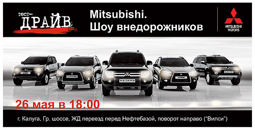 26 мая, четверг в 18.00 автосалон "КАСАМ Авто" приглашаем Вас ощутить настоящий внедорожный драйв «Мицубиши. Шоу внедорожников!» Место проведения: г. Калуга, ул. Грабцевское шоссе, ЖД переезд перед Нефтебазой, поворот направо ("Вилси")