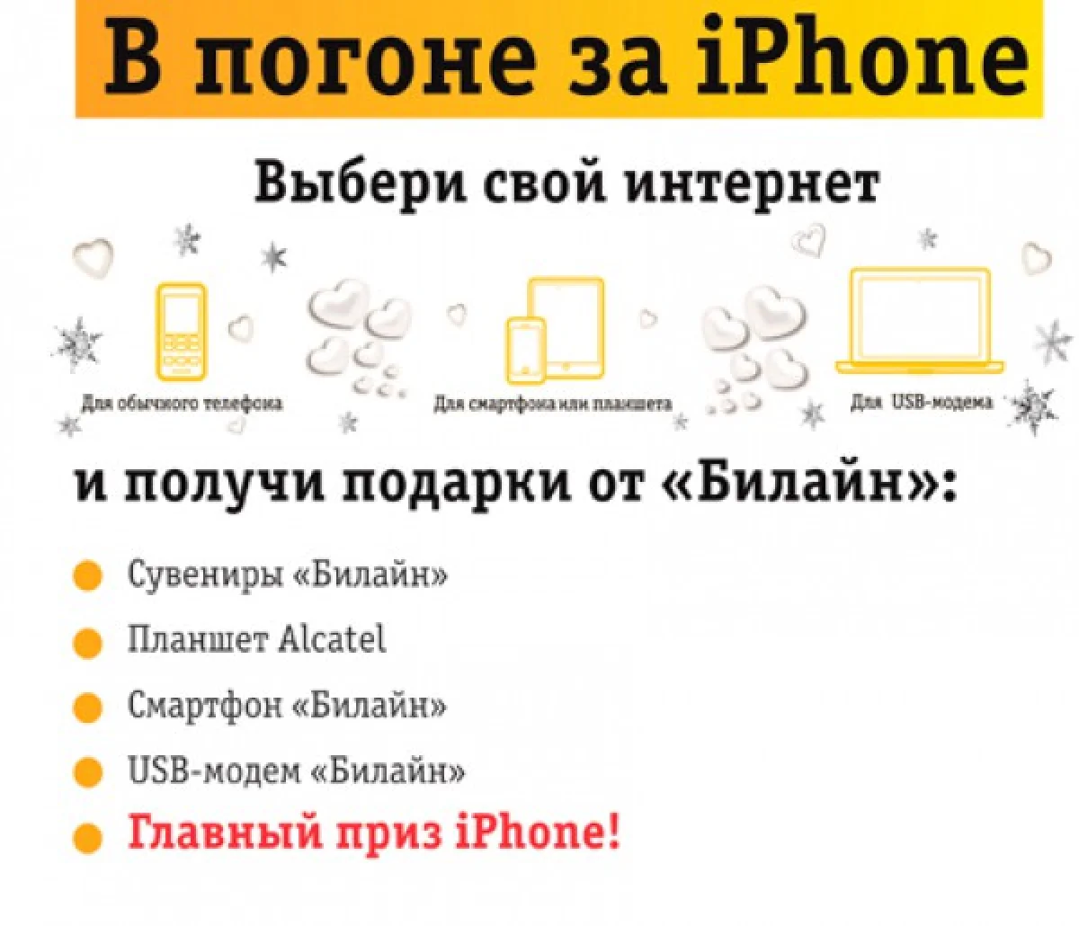 Участвуйте в акции «В погоне за iPhone» и выигрывайте отличные и полезные гаджеты– планшет, смартфон, USB-модем. Главный приз – iPhone 4! Каждый участник акции гарантированно получит яркий брендированный подарок.