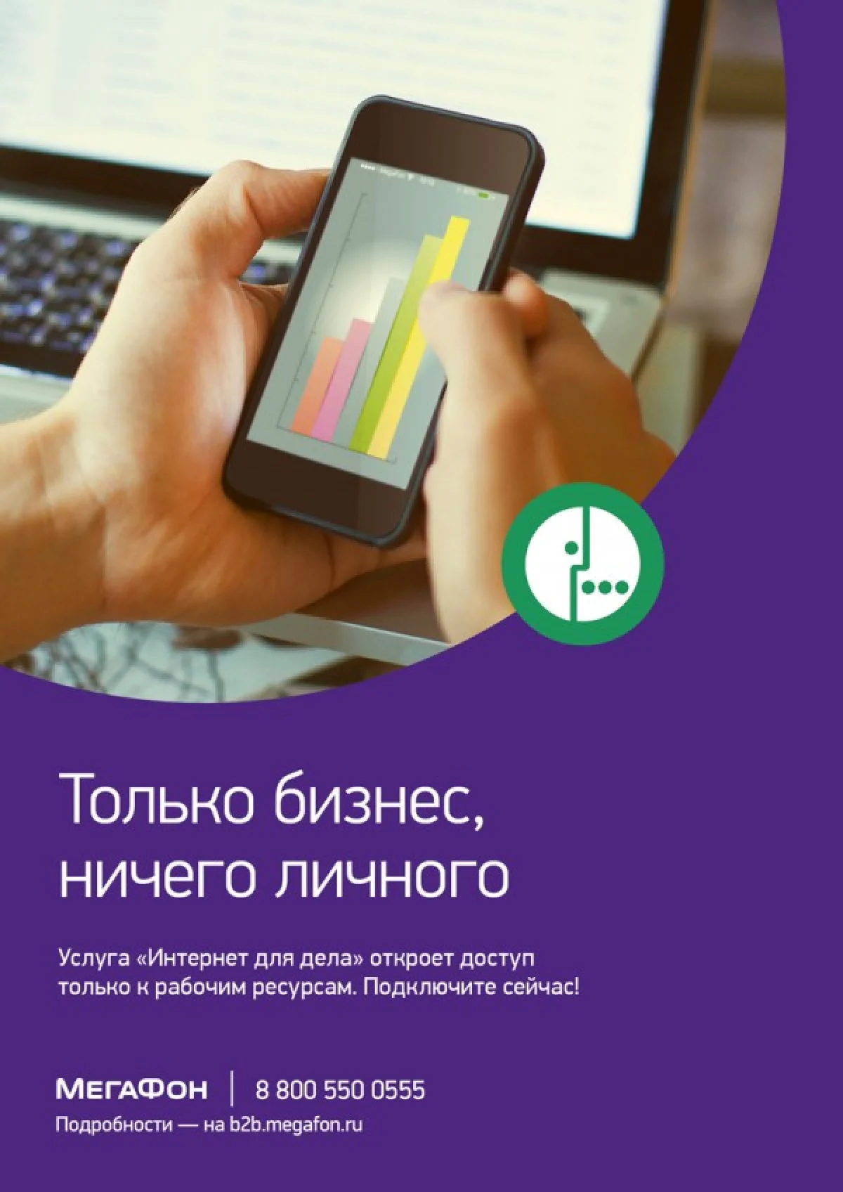 25 ноября 2014г, Центральный филиал. «МегаФон» в Центральном филиале предложил своим корпоративным клиентам новую услугу «Интернет для дела». Данный сервис ограничивает доступ к веб-ресурсам, которые не относятся к корпоративным или деловым инструментам. А также блокирует потенциально опасные сайты, способные заразить мобильные устройства сотрудников вирусами, и защищает пользователей от утечки важных корпоративных данных.