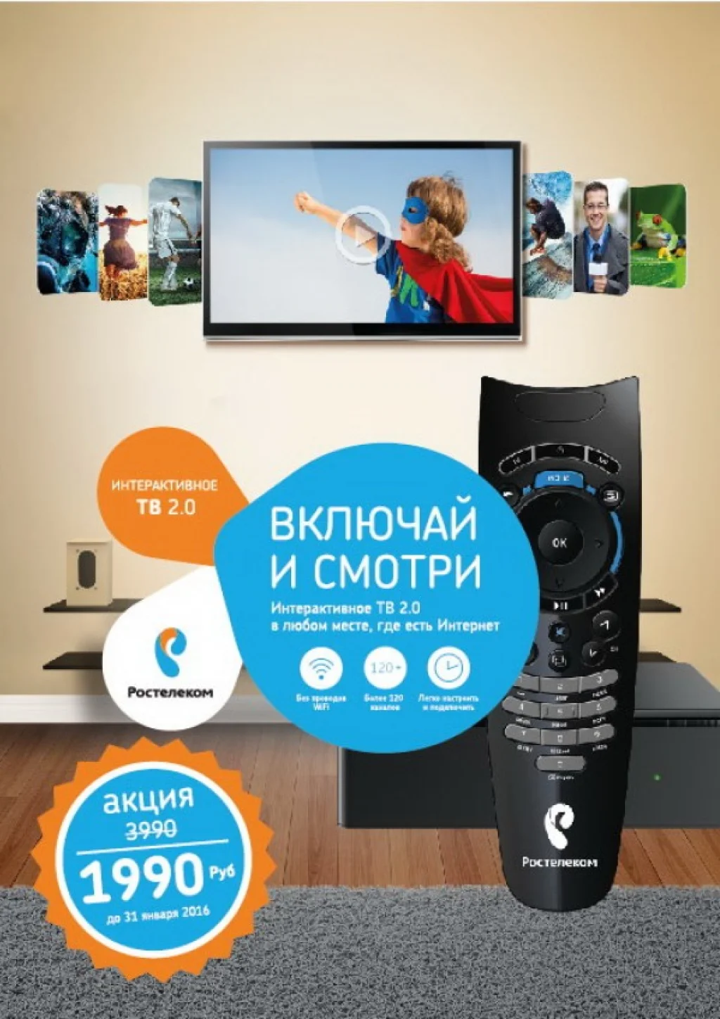 Приставку «Интерактивное ТВ 2.0» можно приобрести по специальной цене – 1 990 рублей – до 31 января 2016 года. По окончании акции на нее будет действовать цена 3990 рублей.