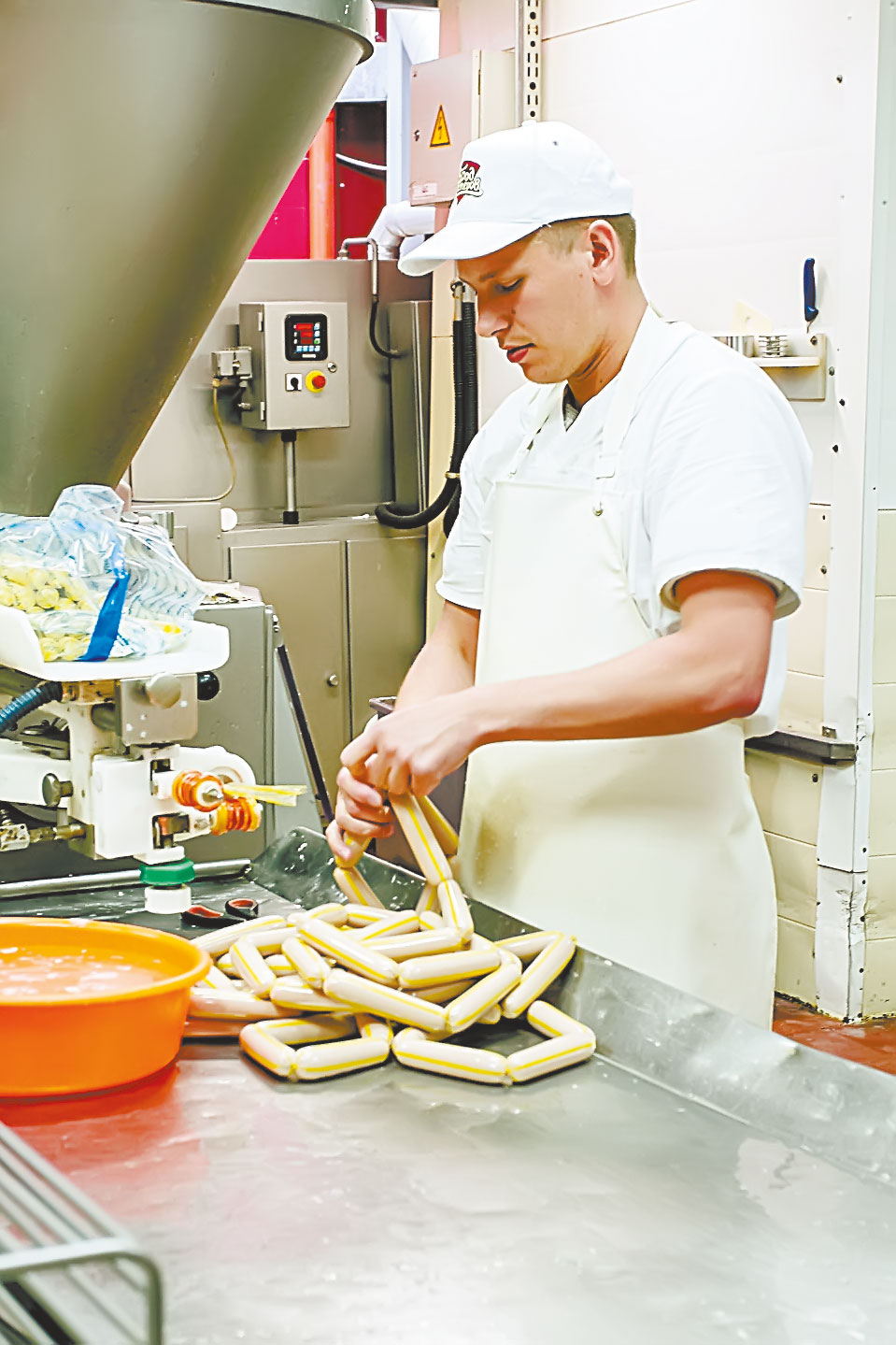Все оборудование на предприятии новое – немецкое. В шприц (это оборудование, предназначенное для наполнения различных оболочек колбасным фаршем) уже внесена информация о порциях колбасы, сарделек или сосисок. Рабочим лишь остается вручную их связать, развесить на специальные рамы и отправить на термическую обработку.