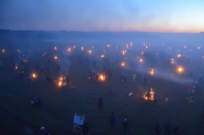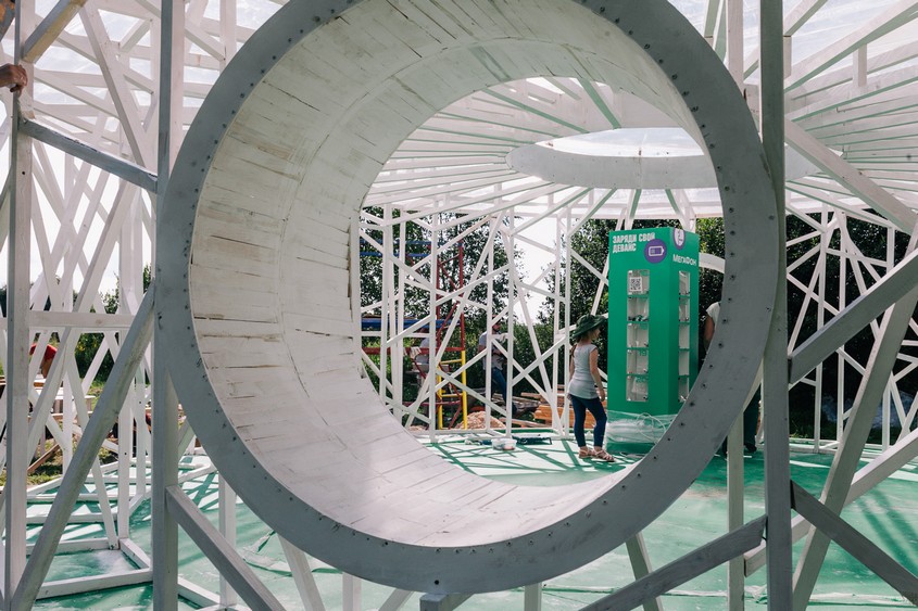 Теперь о необычном арт-объекте – полевая гостиная «МегаФон». Он был спроектирован архитектором творческой группы «8 линий» Ниной Гогиной и куратором «Архстояния» Антоном Кочуркиным. По словам авторов проекта, хаотично расположенные бруски, составляющие каркас павильона, символизируют паутину сотовой связи. Если удастся взглянуть на беседку сверху, то можно увидеть, что ее форма повторяет логотип МегаФона.