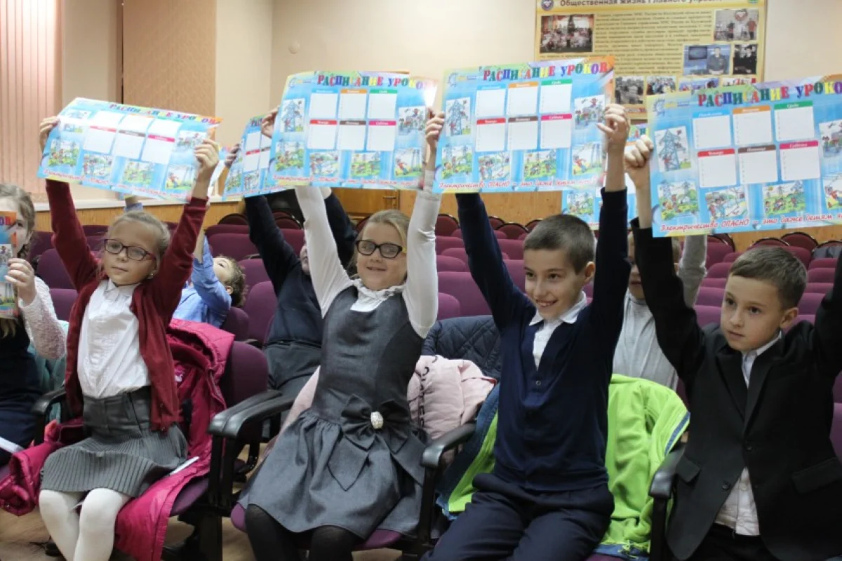 На память об уроке ребята получили наглядные пособия по электробезопасности: расписания уроков и закладки.