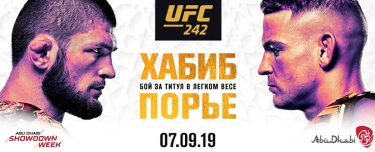 Завтра, 7 сентября 2019 года, состоится самый ожидаемый в России турнир UFC® 242: Хабиб vs Порье, который пройдёт в Абу-Даби (Объединенные Арабские Эмираты). Главным событием вечера станет бой за объединение поясов в легком весе между чемпионом Хабибом Нурмагомедовым и обладателем временного титула Дастином Порье.