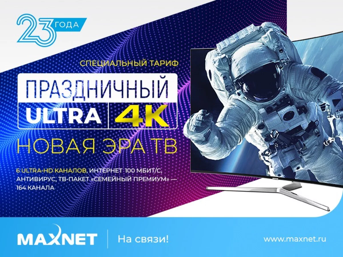 По традиции в честь Дня рождения Макснет, мы делаем специальное предложение для новых и существующих домашних абонентов. В этом сентябре мы выводим на рынок новый продукт, который стал логическим продолжением развития цифрового телевидения Макснет. Речь идет о пакете 4K, в который вошли 5 телеканалов, вещающих в формате Ultra HD. Попробовать новинку можно в специальном тарифном плане «Праздничный Ultra 4K». Мы собрали в нем все самое лучшее от Макснет, а именно: