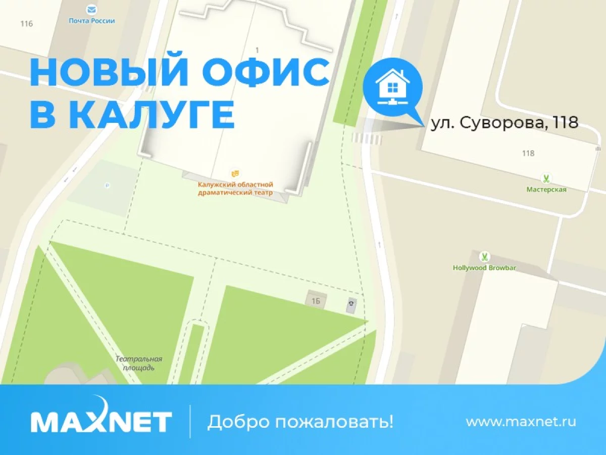 Калужский оператор связи Макснет Системы сообщает о переезде в новый офис обслуживания домашних абонентов по адресу: