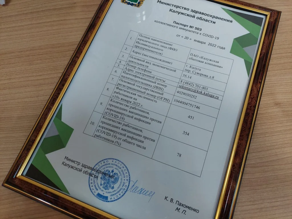 Калужская сбытовая компания получила Паспорт коллективного иммунитета