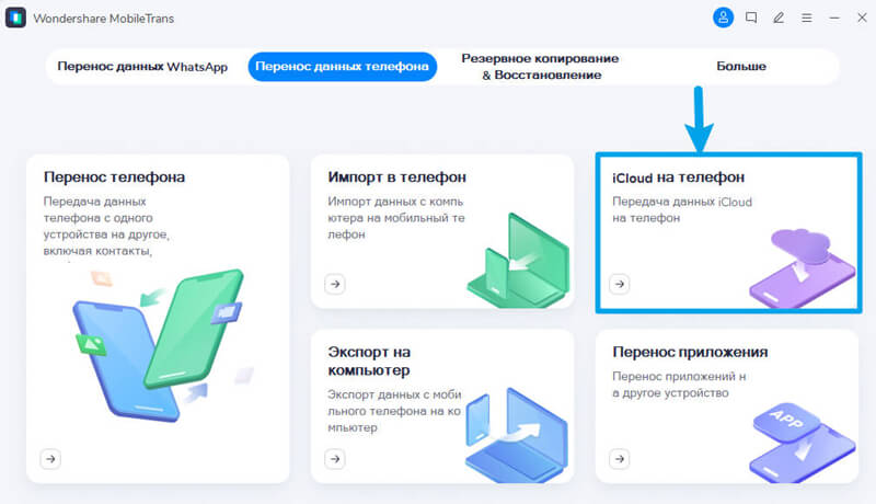 1. Скачиваем, устанавливаем и запускаем программу MobileTrans. В центральном разделе навигационного меню выбираем вкладку «Передача данных телефона» и щелкаем по опции «iCloud на телефон».