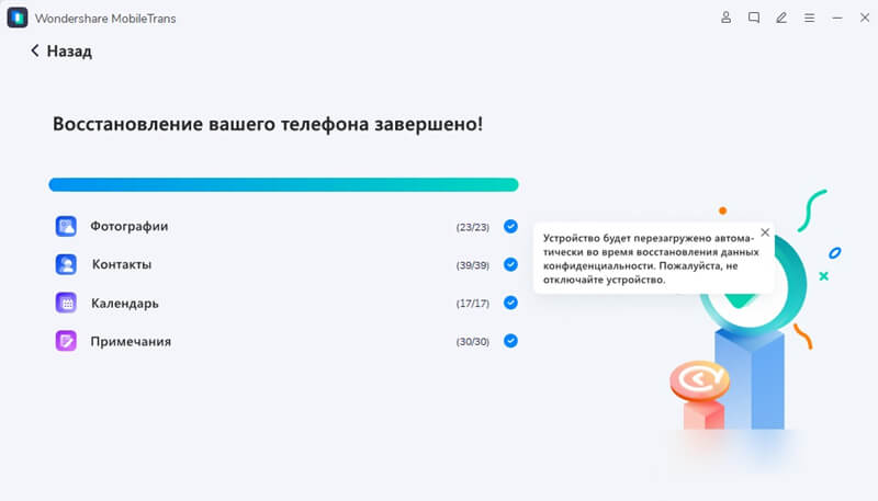 На выполнение представленной работы уйдет не более 10-15 минут, включая то время, которое придется потратить на загрузку и установку приложения. Все дальнейшие операции программа Wondershare MobileTrans выполнит в автоматическом режиме, без какого-либо участия со стороны пользователя. После завершения операции она отчитается об успехе, отобразив на экране соответствующее уведомление.