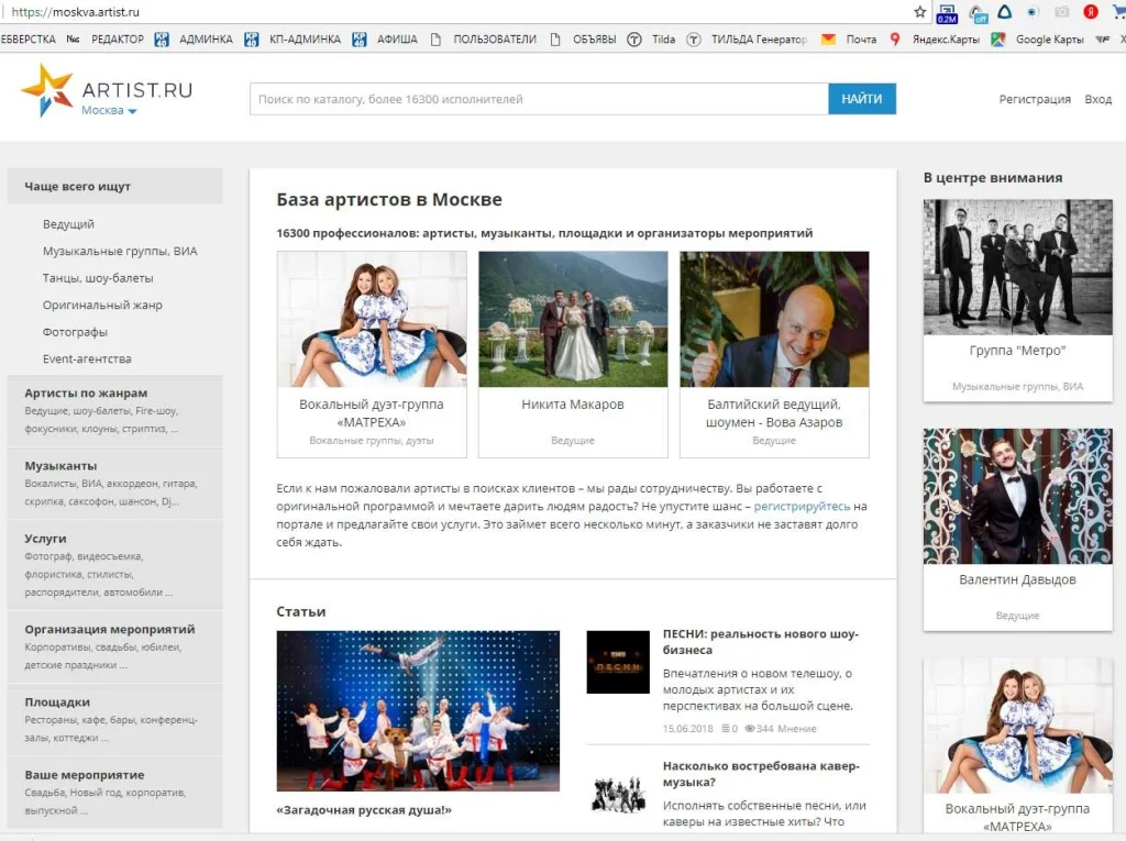 - Большой каталог артистов разных жанров и направлений. На площадке представлено более 10 000 анкет со всей России.