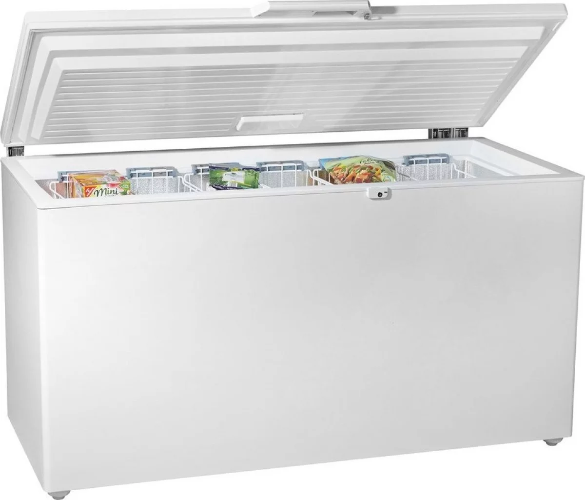 Морозильный ларь способен вместить до 380 л. продуктов. Модель выполнена в классическом белом цвете, поэтому легко впишется в любой интерьер. Класс энергоэффективности — А+ (313 кВт/год). Производительность составляет 25 кг. в сутки. Агрегат сохраняет оптимальную температуру внутри камеры в течение 40 часов после отключения электроэнергии. Есть функция защиты от детей, а также режим быстрой заморозки.