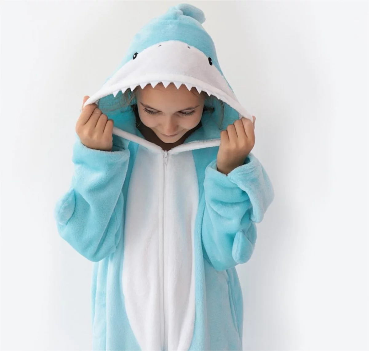 Кигуруми имеет идеальную конструкцию для детской пижамы. Это широкой комбинезон с капюшоном, манжетами на рукавах и штанинах. На поясе нет резинки, которая в других пижамах может давить на живот.