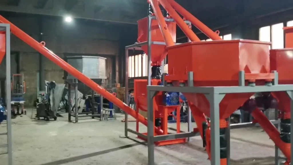 Линии производства сухих и увлажненных строительных смесей включают ряд сооружений и оборудования, связанных между собой в единый механизм. Основным узлом линии является смеситель с дозирующим узлом. В верхней ее части возвышаются растариватели Биг-Бегов, приемные и накопительные бункера, силосы, где хранятся портландцемент, цемент, гипс, известь, известняковая мука, песок фракции от 0,3 до 2,6 мм.