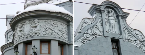 Кроме этого купец внёс изменения в проект здания, и в память о детях на фасаде особняка появились два амура с крыльями - это Катенька и Вася. Они, словно небесные ангелы-хранители, держат фамильный герб купцов Терениных. А фронтон дома со стороны улицы Воскресенской украсила античная фигура девушки - точная копия с семейной фотографии их любимой дочери Любушки!