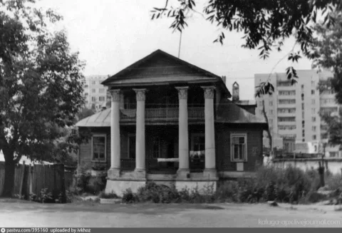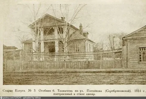 Усадьбу Толмачёвых в Калуге построили в 1814 году, рядом был разбит французский парк, устроены пруд и оранжереи. Такими же домами застраивалась и послепожарная Москва. Сначала хозяином был купец-старообрядец Хвостов, а в 1874 году усадьба перешла по купчей, к жене калужского казначея Гончаровой, родственнице Натальи Пушкиной, супруги поэта, а от неё в 1881 году к дворянам Толмачевым. Тогда здесь была окраина города, а неподолёку находился овраг, и сельское кладбище.