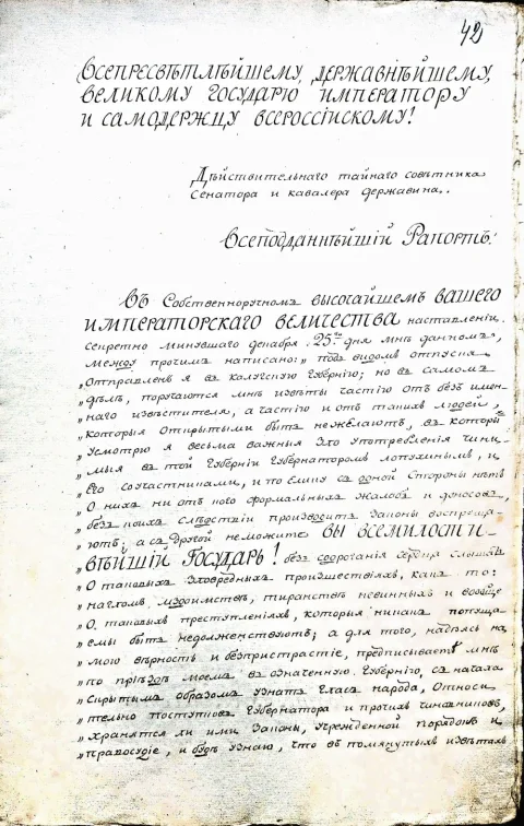 Он также отправлял жалобы императору, на бесчинства губернатора, действительного статского советника Дмитрия Ардалионовича Лопухина.