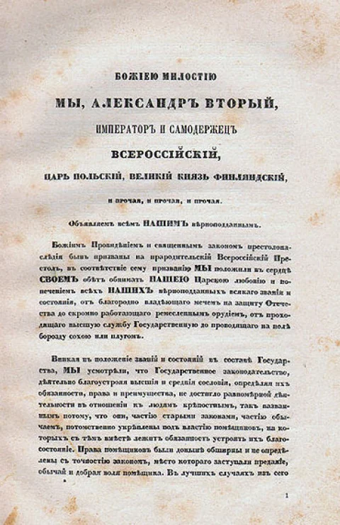 В 1855 году на престол взошёл Александр II, который и стал "Освободителем". Парадоксально, но на решение отменить крепостное право повлияло его увлечение...охотой. Будучи страстным охотником, Александр II с интересом прочел "Записки охотника" Ивана Тургенева. Позднее он говорил, что эта книга убедила его в необходимости освободить крепостных. И 19 февраля 1861 года в Петербурге произошло событие, которого Россия ждала веками. Манифест об отмене крепостного права был подписан. "Осени себя крестным знамением, православный народ, и призови с нами Божие благословение на твой свободный труд..." - торжественно провозглашал документ. Но что стояло за этими высокопарными словами?