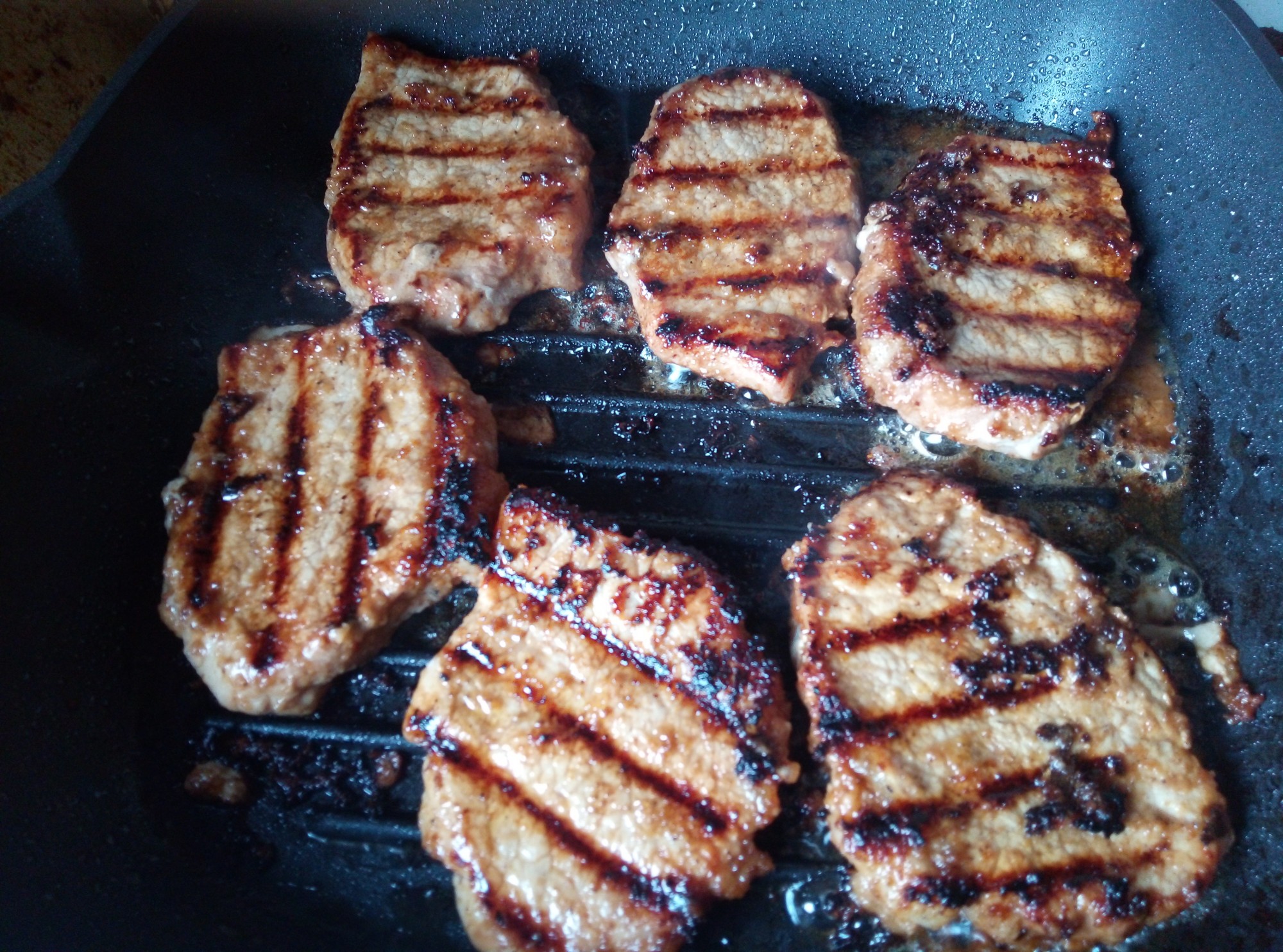Жарить следует где-то по 5 минут с каждой стороны до появления эффекта Майера. Грубо говоря — добиться карамелизации и запечатывания. Постоянно смазывая маринадом.