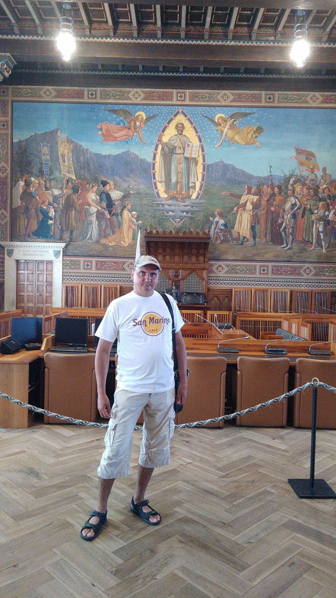 Мало того, я ж еще, супостат этакий, в санмаринской святая святых - зале заседаний ихнего двуглавого правительства свежекупленную майку переодел! Бессоветно и нагло, прям под камерами наблюдения! Теперь-то понятно почему меня прямо там не скрутили. Опешили от такой наглости настолько, что я еле успел неторопливо скрыться от правосудия. Вот пруф, если не верите!