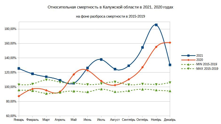 За 2021 год умерло 19488 человек, в сравнении с 17200 в 2020 году (4 месяца без пандемии) и 15036, которые умирали в 2015-2019 годах. Рост смертности составил 30% (в 2015-2019 годах разброс в годовой смертности не превышал -2,3%..+1,3% ).