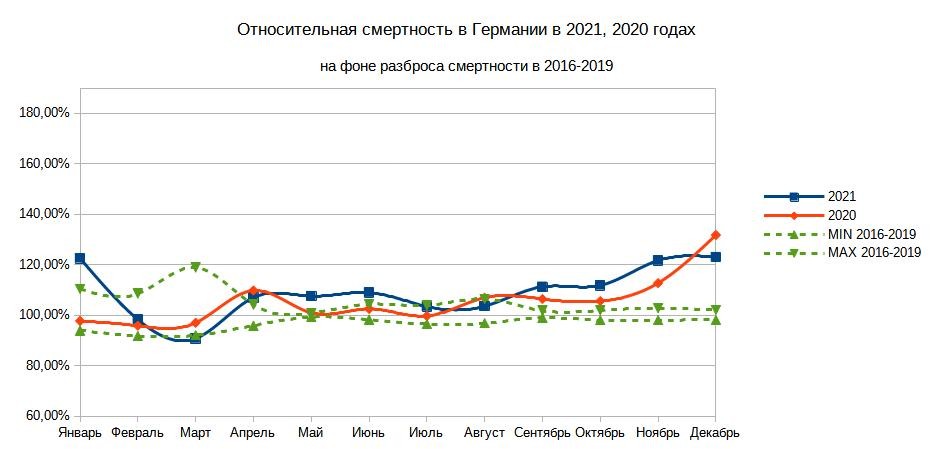 Для сравнения относительная смертность в Германии, видно, что дельта обеспечила значительный рост смертности, который тем не менее не превысил и 25%
