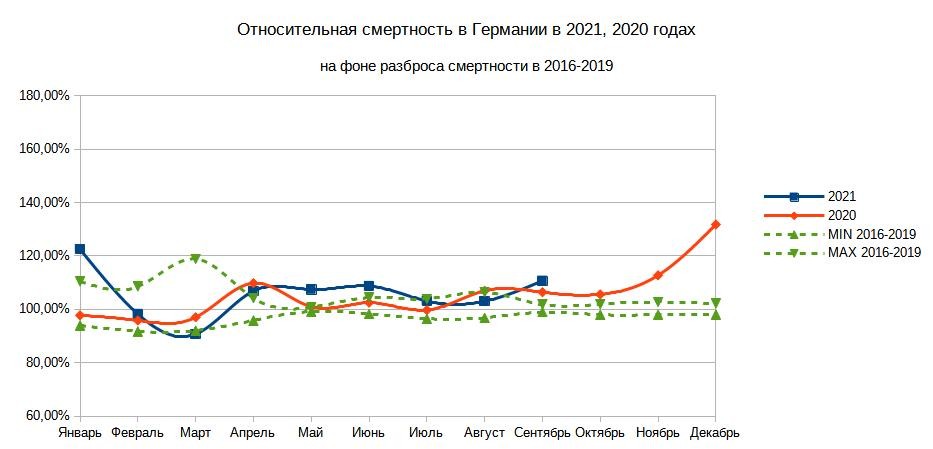 В Германии за весь период эпидемии смертность выросла на 7%, т.е. в три раза меньше. Но "они же тупые!!!"(tm), носили маски, соблюдали карантин, массово прививались.