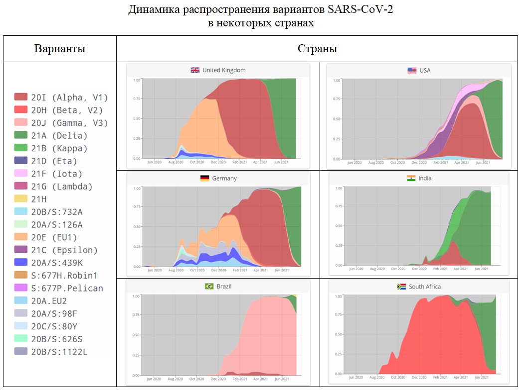 С ходу попался только этот график с хабра (https://habr.com/ru/post/572490/), где показано замещение штаммов в популяции по некоторым странам