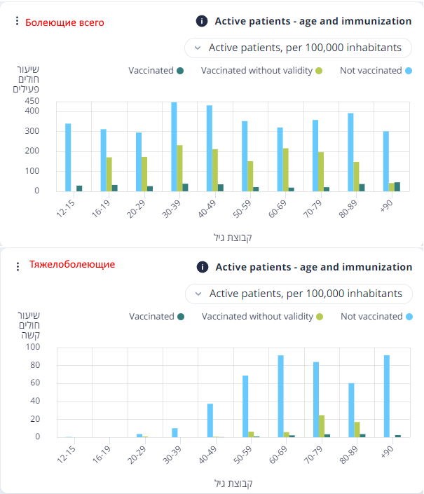 вот, например, данные по Израилю, голубой цвет - непривитые, темно-зелённый полностью вакцинированные на данный момент. Если поглядев на эти графики человек заявит, что "вакцинированные болеют точно так же, как и невакцинированные" - ему стоит пройти экстренную диспансеризацию включая посещение офтальмолога и психиатра.