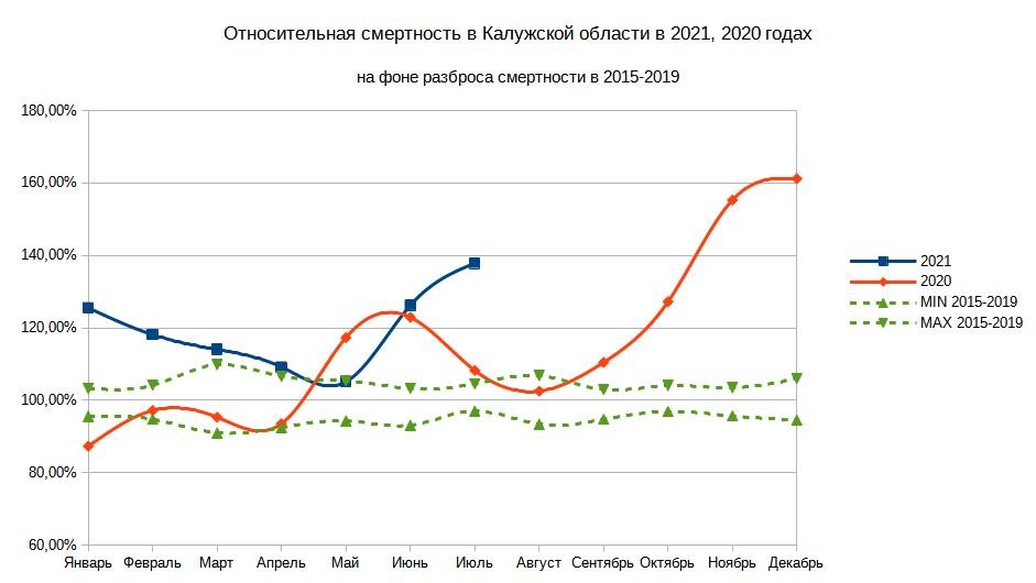Избыточная смертность - выросла на 38% (460 человек) по сравнению с 2015-2019. В июне было 26% (325 человек). Это существенно лучше, чем я ожидал. Я опасался, что рост составит до 50-60%.