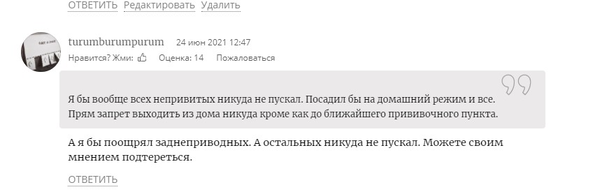 А вот не надо перекладывать с больной головы на здоровую. Почему я привитый должен терпеть ограничения изза неумных людей веряших в слухи и откровенную ересь антипрививочников? Надо непривитых которые без противопоказаний и не прививаются в правах ограничивать так как они прямая угроза здоровью людей. В транспорт не пускать, в магазины тоже и вообще в закрытые помещения. Пусть удаленно работают, на самокатах ездят и на доставку раскошеливаются.