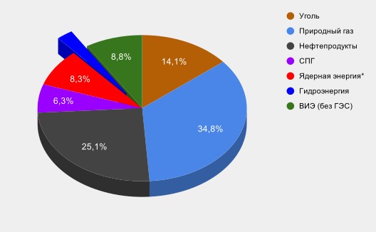 Структура производства первичной энергии в США 2019 году, проценты