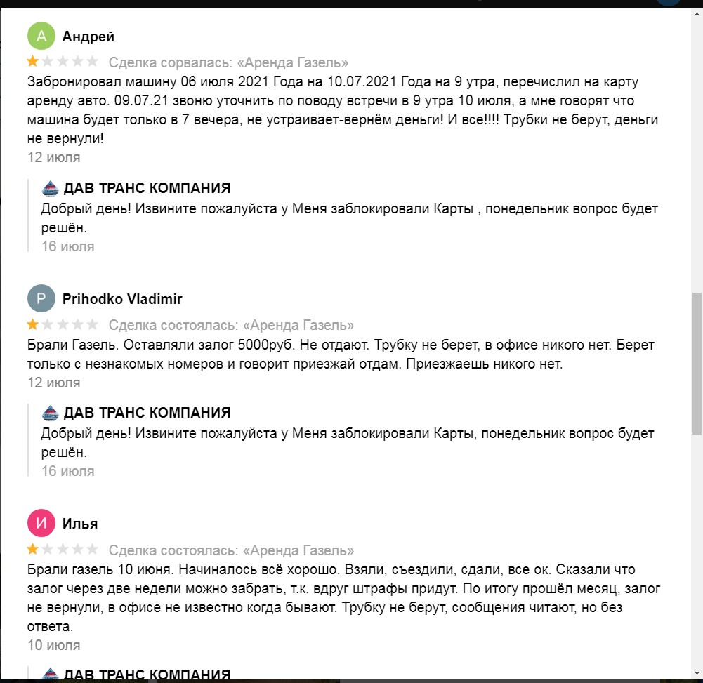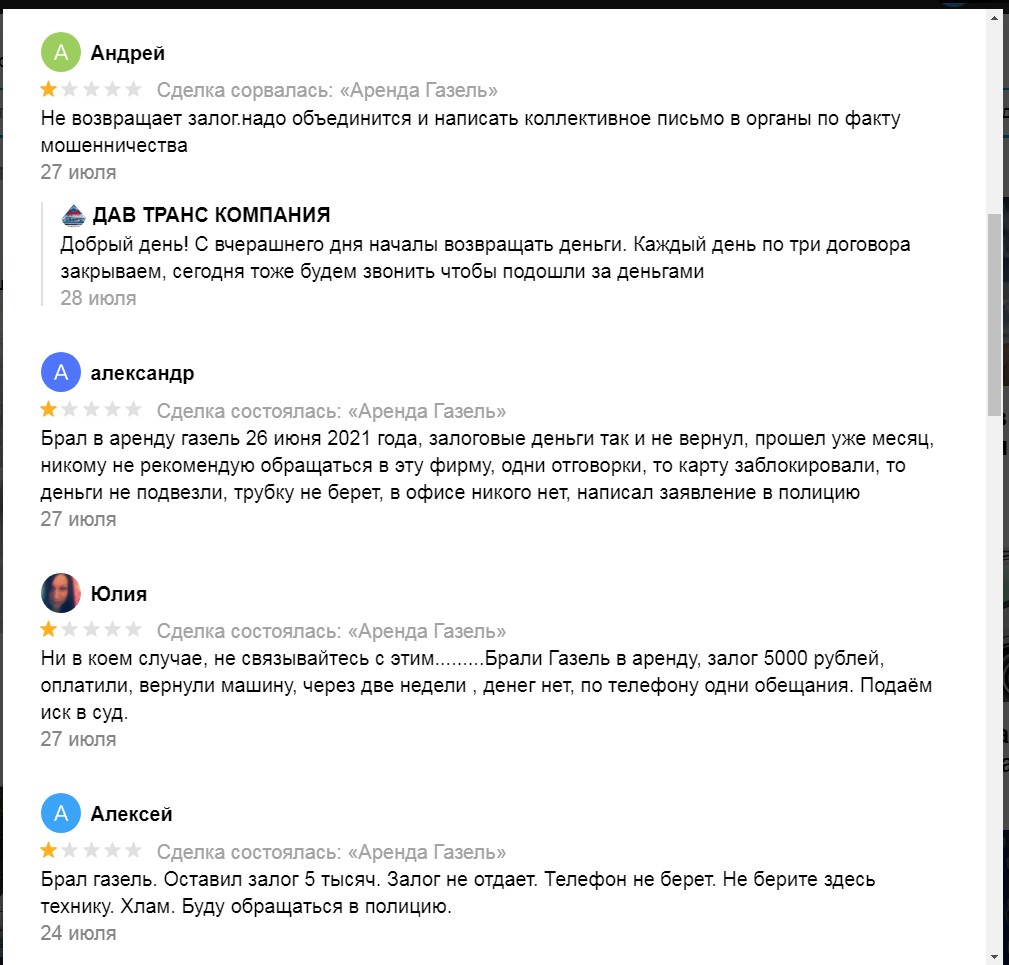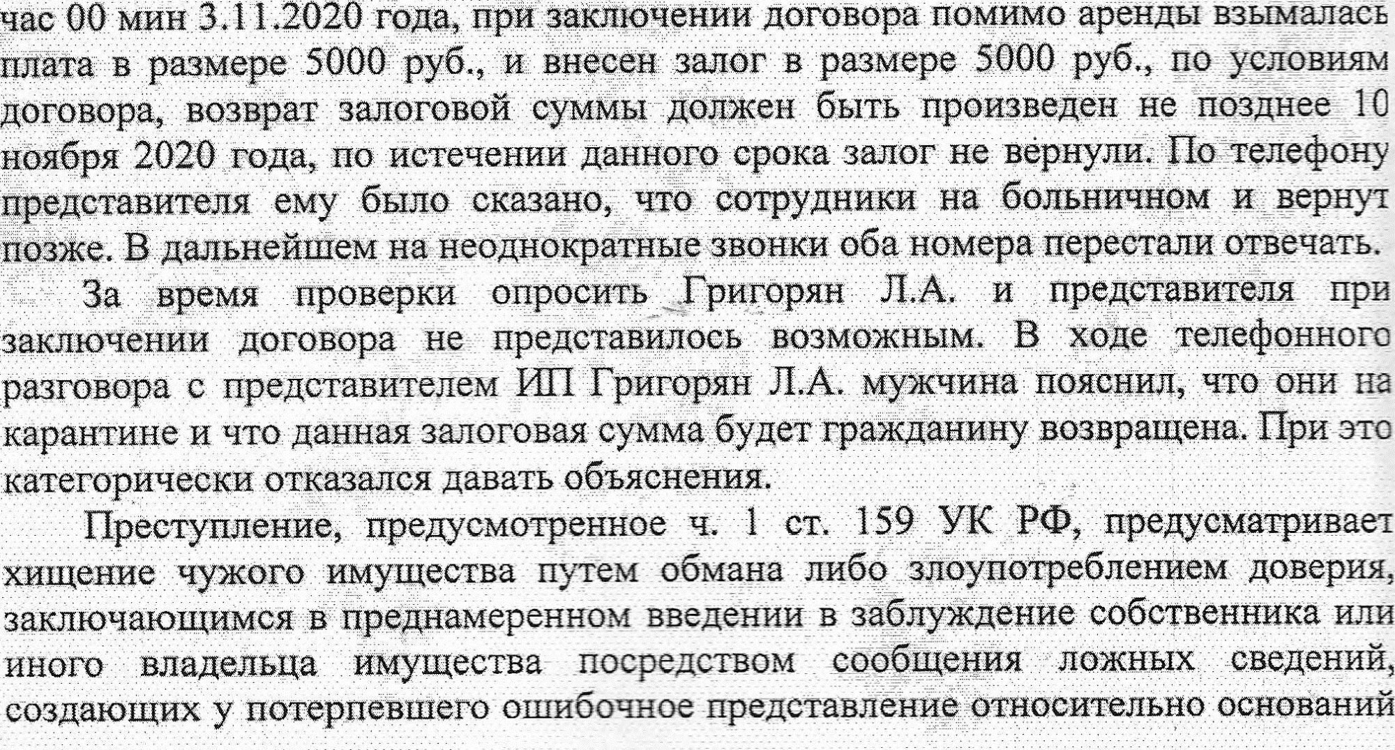 Как же знакомо. Случайно не в отделение полиции №2 попало ваше заявление? Брал газель на сутки, взяли залог 5000 и не вернули. В полиции описались - мы ему позвонили, он сказал, что на карантине и потом вернёт. Занавес! И таких "кинутых" много. Теперь то я понял. почему взял 5000 - это административка. Потом увидел, что на нём долгов по судам висит под миллион годами и никто не торопится их взыскивать.