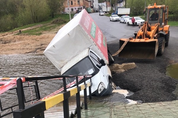 Автомобиль по неизвестным пока причинам съехал с горки и протаранил три легковушки, которые стояли возле понтонного моста. По словам очевидцев, одной из поврежденных машин был Volkswagen Touareg.
