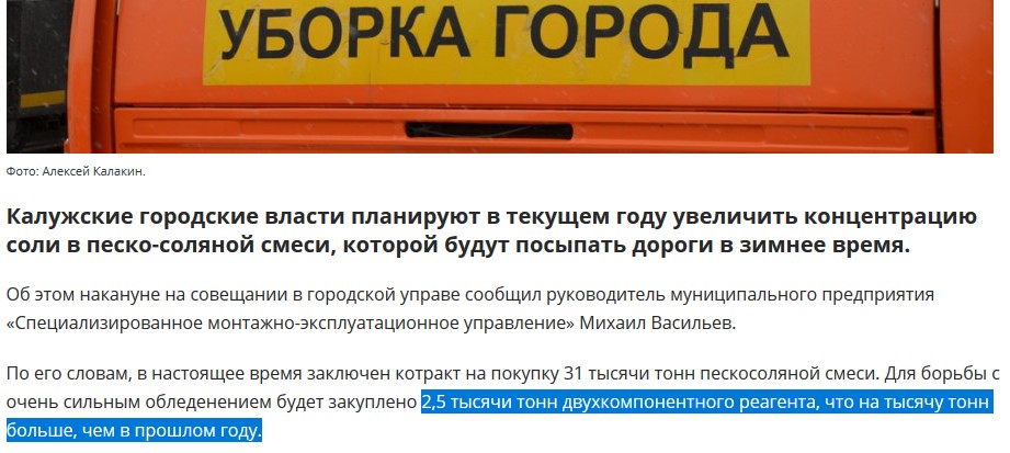 - Чтобы перейти исключительно на современные химические реагенты, нам необходимо потратить на очистку города дополнительно 247 миллионов рублей, - объяснил Шпиренко. - У нас разве других проблем нет? Это очень большая сумма. Поэтому в Калуге в основном используется песко-соляная смесь.”