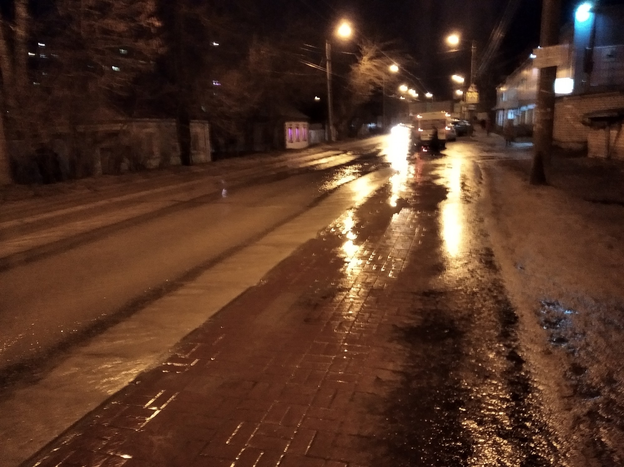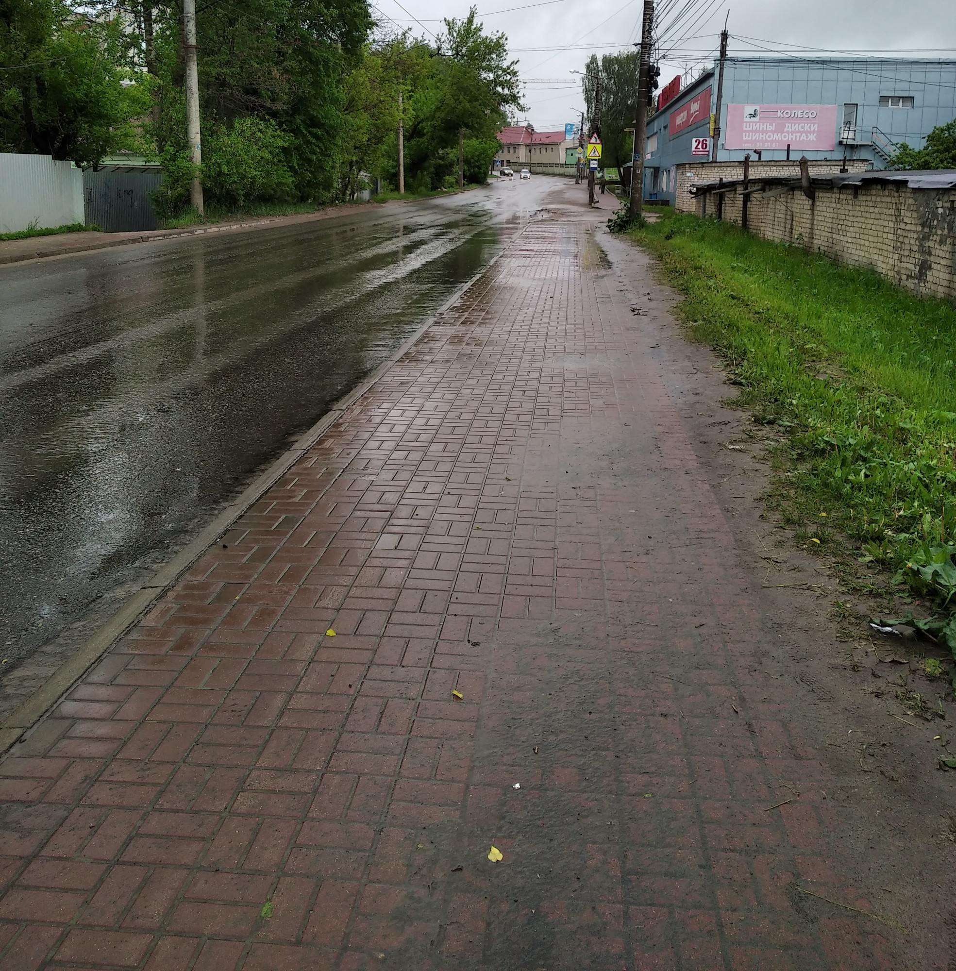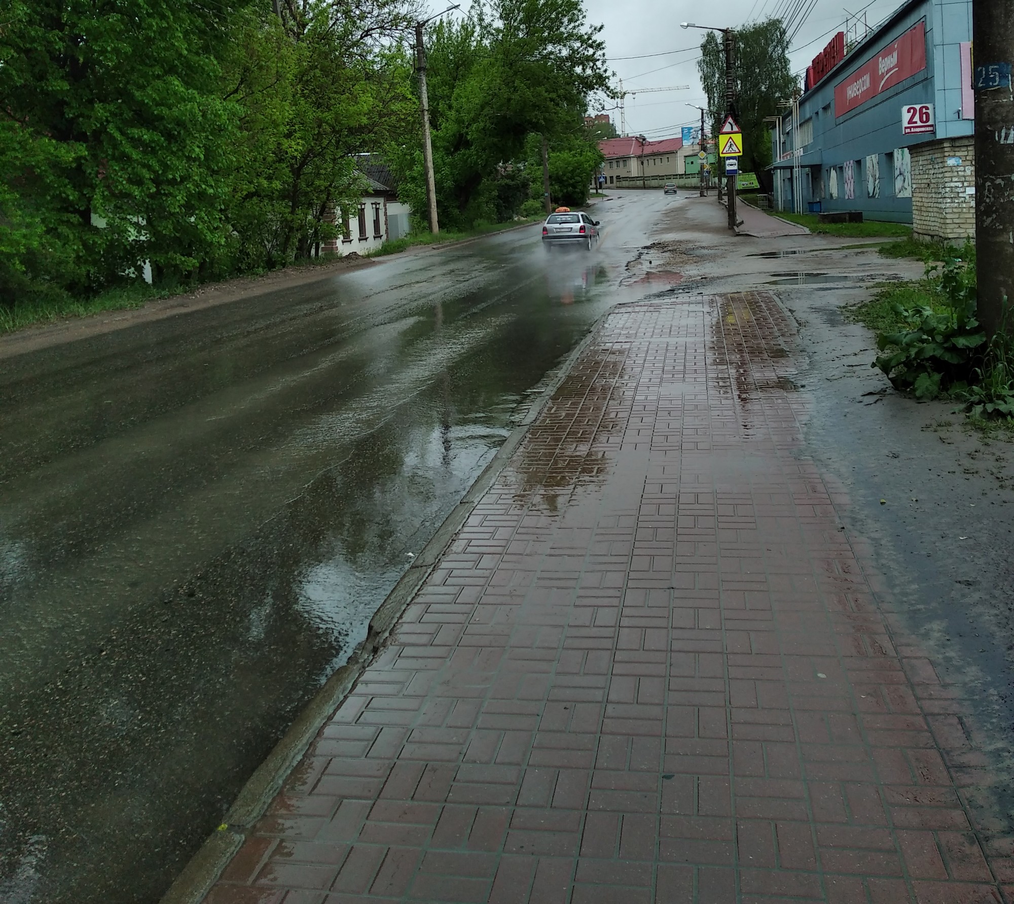 Смотрите, какая чистая плитка на тротуаре! Хорошо работают, на месте не сидят. Но, увы, чистая плитка оттого, что всю ширину тротуара омывают проносящиеся мимо автомобили. Потому что Азаровская в непогоду - русло реки (сейчас в очередной раз затеяли замену верхней корки асфальта). Вот пример русла реки: