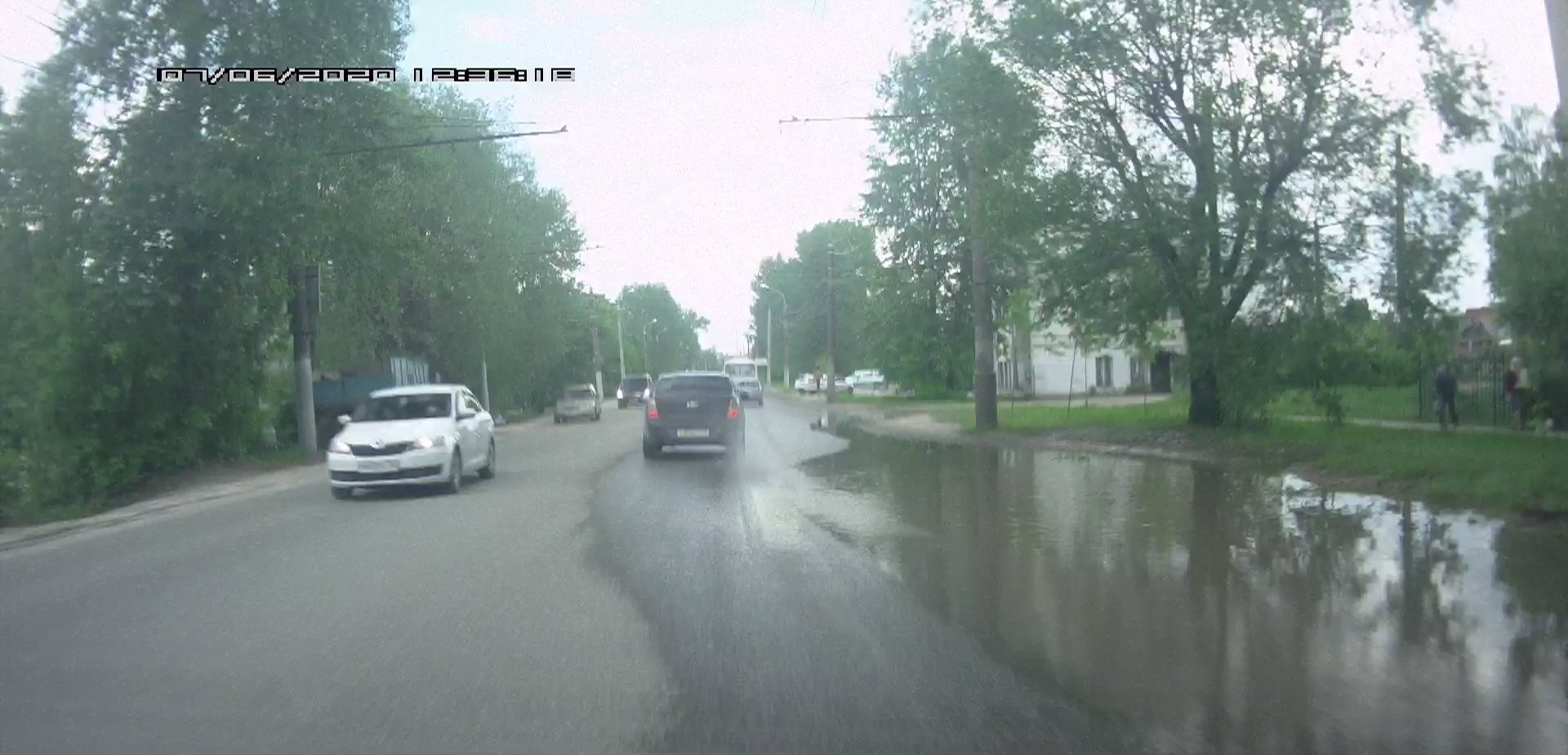 Остановка без "кармана" со свежевыложенной плиткой, которую обтекает вода: