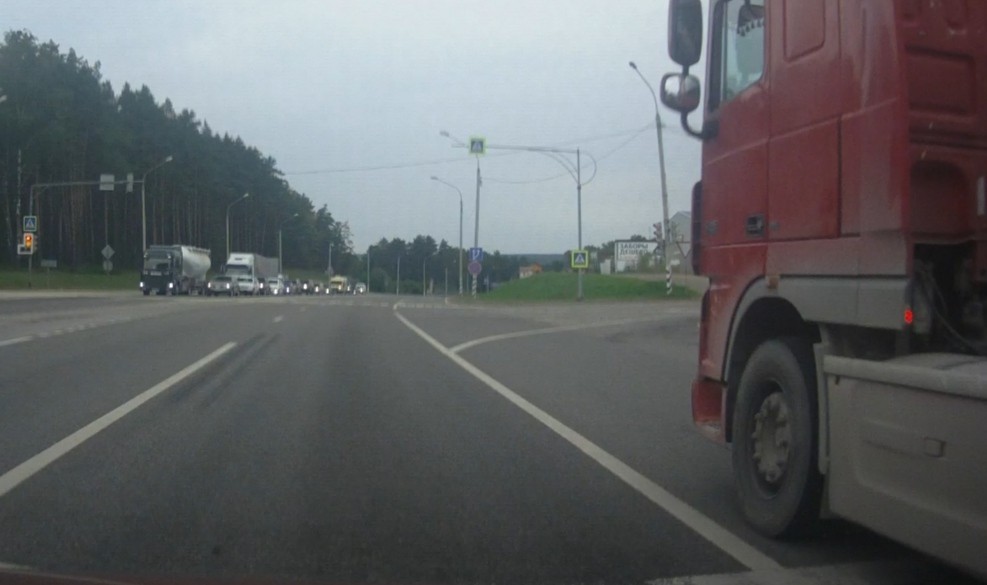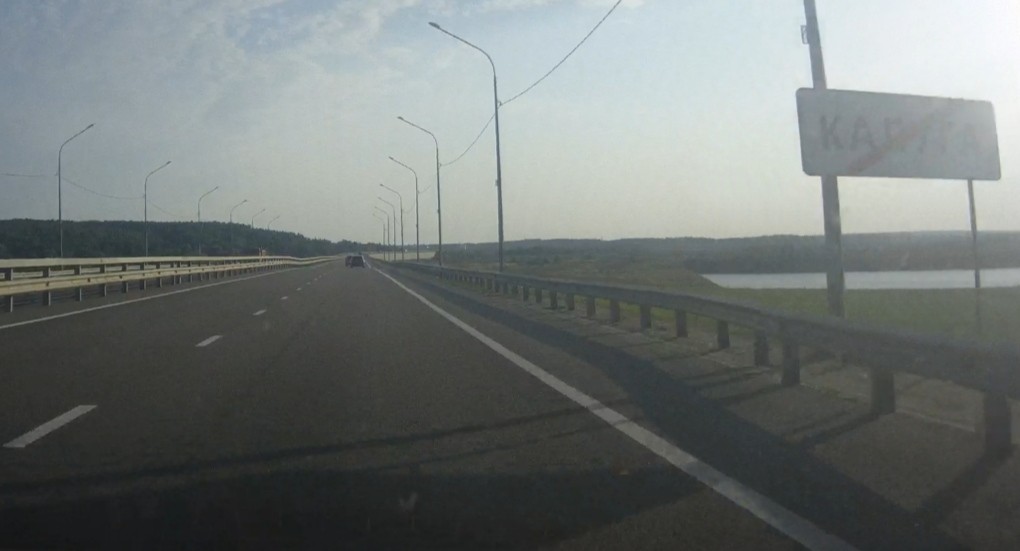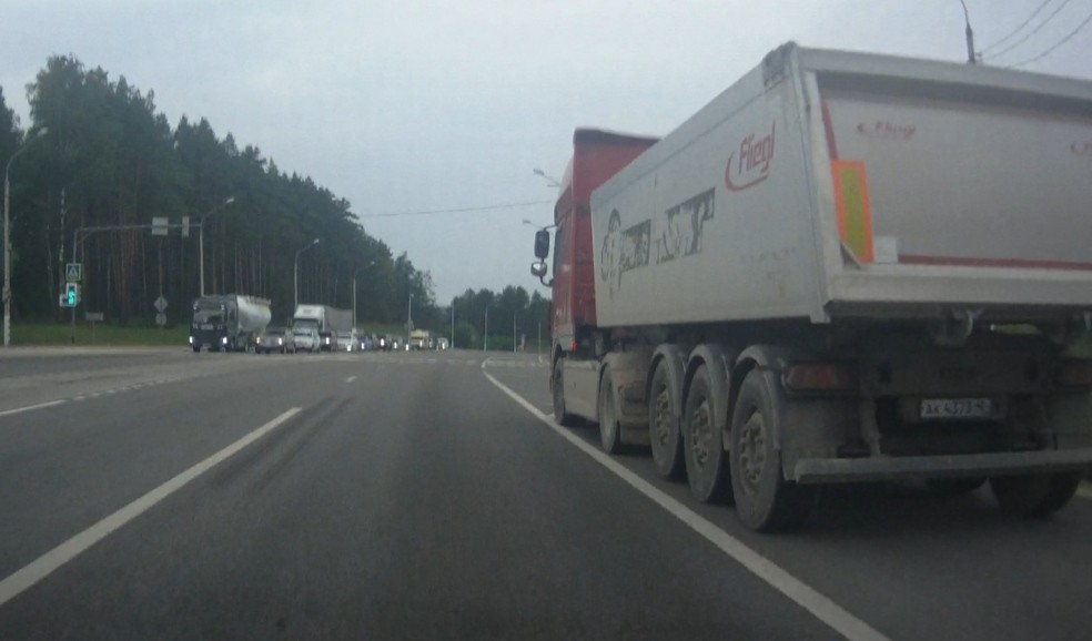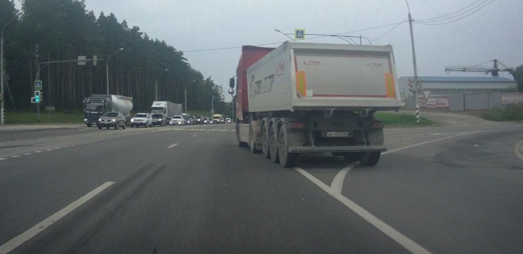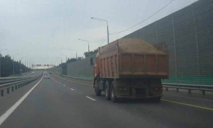 Возле Ерденево делают эстакаду, по платнику несётся самосвал, песок в кузове никак не прикрыт. За самосвалом песчаная буря.