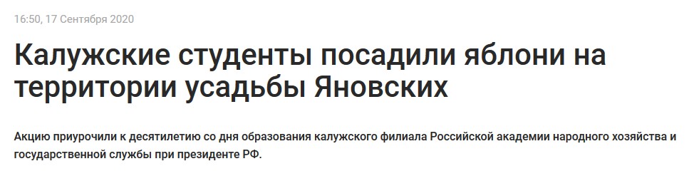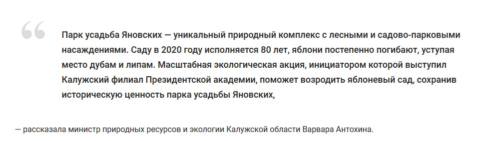 “Экологическая акция «Яблоневый сад РАНХиГС» прошла на территории усадьбы Яновских, в популярном месте отдыха калужан, где по выходным собираются многочисленные компании, часто гуляют мамы с колясками, выходят на пробежки любители здорового образа жизни.