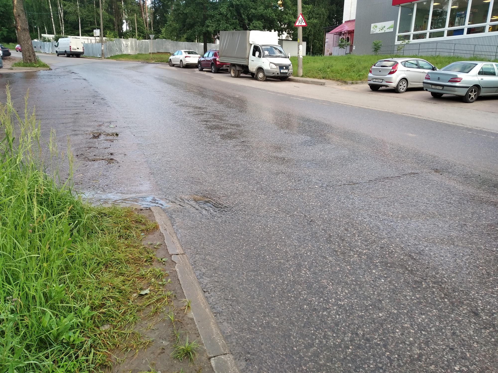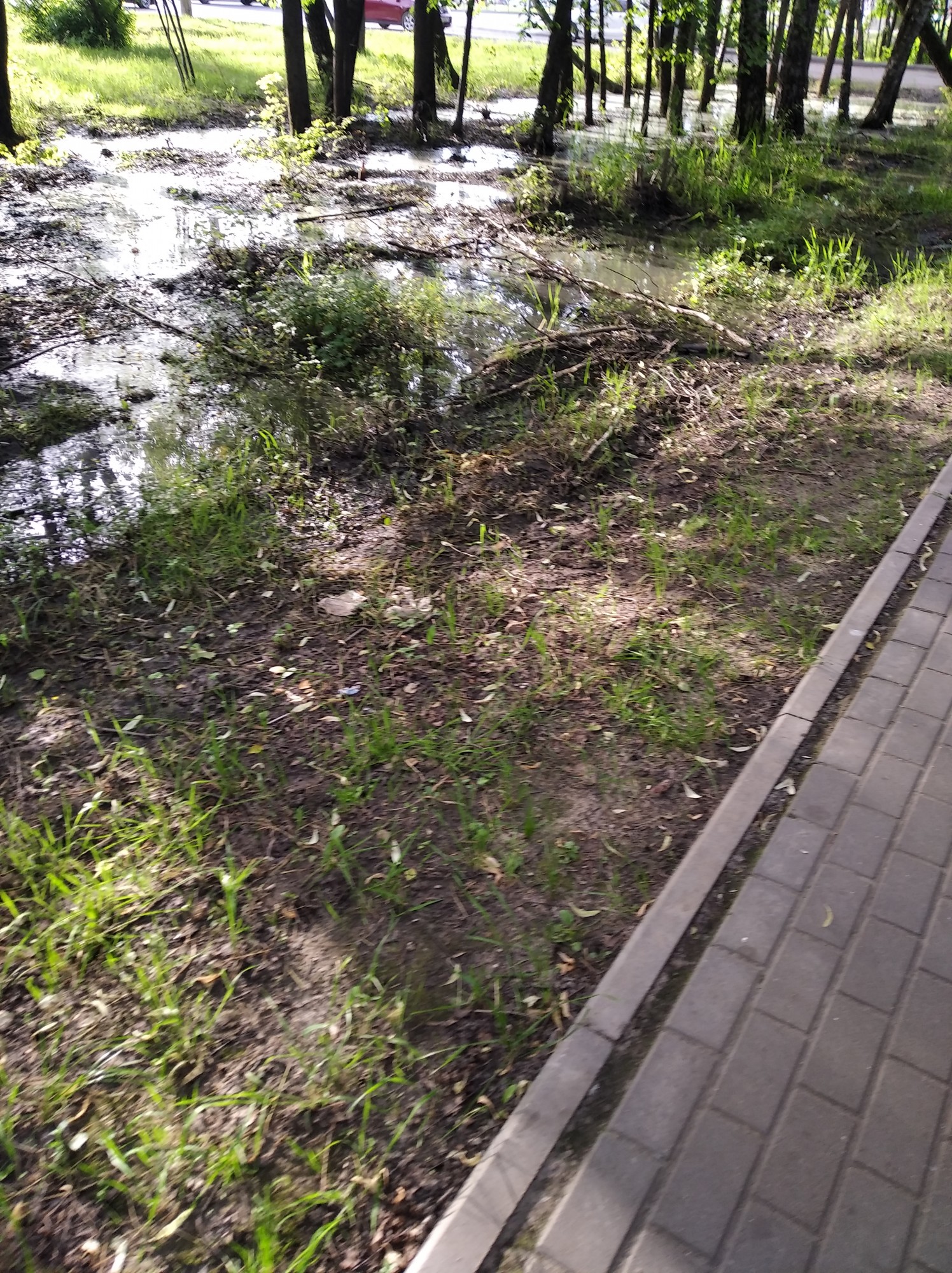 Вот заповедное место напротив торгового квартала: Бордюры уложены прямо на землю? Водоотвода нет, в результате образуется вот такое болотное гетто для деревьев.