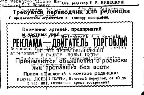 Немцы думали поселиться в Калуге всерьез и надолго. Для того, чтобы все выглядело, как в лучших домах, решено было издавать еженедельную местную газетку на средне-русской языке. Для настоящего русского языка не хватало сил. В качестве редактора газетки был румын по фамилией Бунескул. Газетка (как писалось ранее), вышла в городе Калуге в количестве всего четырех номеров. Дальше деятельность Бунескула прекратилась, так как город Калуга был отбит частями Красной Армии. Но и четыре вышедшие номера свидетельствуют об интенсивной хозяйственной жизни недолговременных хозяев города Калуги. "Реклама — двигатель торговли", - сообщается в отделе объявлений этого печатного органа. "Открыт прием объявлений в газету "Новый путь".