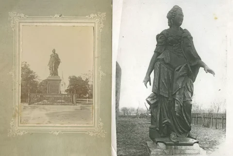 Скульптор изобразил Екатерину в виде греческой богини в шлеме и доспехах, что весьма символично. Она в своём деле действительно была воительницей и одержала немало побед. Когда заказ был выполнен и поступил на фабрику. Афанасий Абрамович уже умер, а потомки отправили статую на заводской склад, где она пролежала без малого 50 лет и досталась Наталии Гончаровой в качестве приданого к свадьбе. А.С. Пушкин немало хлопотал, чтобы продать эту, как он называл, «бронзовую бабушку». Но продать её смогла Наталия Николаевна только после смерти мужа. Скульптура оказалась в г. Екатеринославе (ныне Краснодар), её выкупило местное дворянство, где она и стала, собственно, памятником. После революции большевики памятник снесли и закопали его в землю. Но уже в 1925 году раскопали и установили у краеведческого музея. В 1941 году во время оккупации памятник был вывезен немцами, и дальнейшая судьба его неизвестна. Видимо, всё-таки переплавили, иначе бы он уже где-нибудь «засветился».