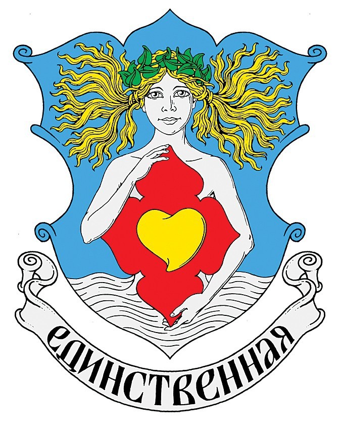 На гербе изображена светловолосая девочка, держащая в руках золотое сердце.