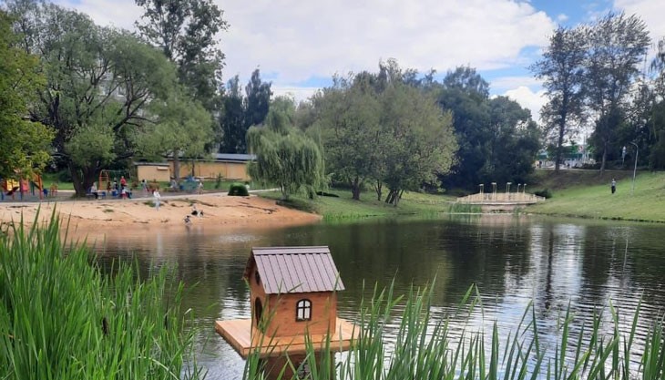 Рядом с прудом располагается спортивная площадка.