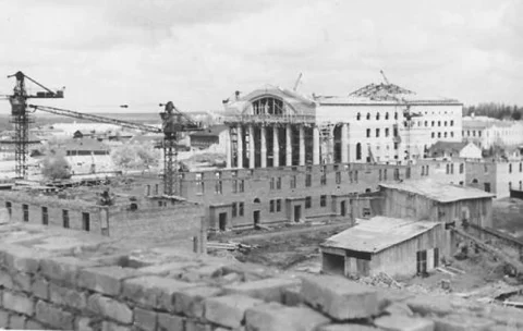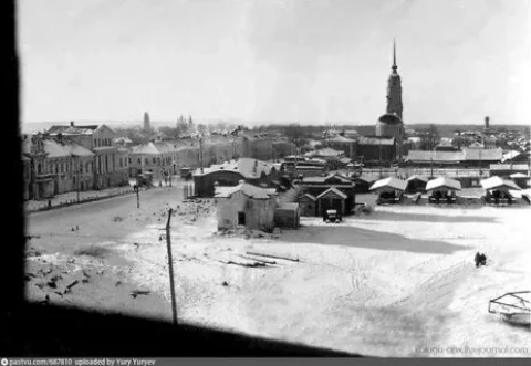 Поэтому, когда в 1945 году всерьез занялись проектом уже нового административного центра, предложения свелись к следующему. Во-первых, старый высокой архитектурной значимости ансамбль в составе Гостиных рядов, бывших Присутственных мест, Троицкого собора предлагалось сохранить, и разрушенные части восстановить. Во-вторых, планируемые к постройке здания Дома Советов, Дома торговли и Драмтеатра расположить на площади Коммунаров, наиболее высокой центральной точке города, с решением их в едином архитектурном ансамбле. С приходом советской власти в 1918г Новый торг (или иначе Базарную площадь) переименовали в площадь Коммунаров.