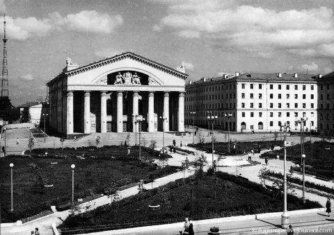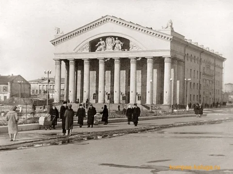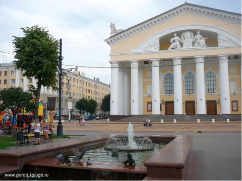Здание областного Драматического театра в Калуге на Театральной площади наследие номер один, архитектуры сталинского ампира, прочно вросло в калужский городской пейзаж. Вообще-то схема развития Калуги, которая начала разрабатываться еще до Великой Отечественной войны, предусматривала движение строительства в северном направлении. Это делало улицу Кирова и её центральную площадь не только композиционным архитектурным, но и геометрическим центром. Но сразу после войны, в силу большой архитектурной насыщенности и законченности старого центра, строительство новых общественных сооружений города в этом районе города было признано крайне нецелесообразным.